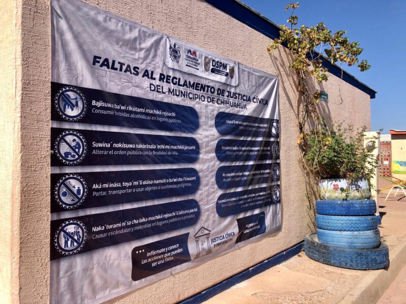 Chihuahua, Chih. A 7 de noviembre de 2023.- Para que todas las personas dentro del municipio de Chihuahua conozcan las faltas más comunes contempladas en el Reglamento de Justicia Cívica, el Gobierno Municipal a través de la Dirección de Seguridad Pública, inició la difusión en asentamientos de la comunidad indígena de la ciudad, para prevenir estos delitos.
