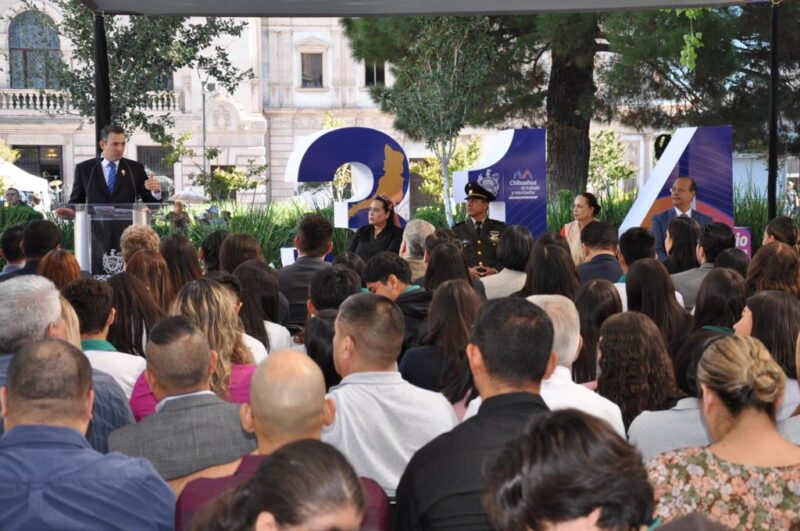 El evento, que tuvo lugar en el centro histórico de la ciudad, contó con la presencia de líderes locales y figuras destacadas. El presidente municipal de Chihuahua, Marco Bonilla, encabezó el acto, acompañado por destacadas figuras locales, como la Directora de Desarrollo Humano y Educación, Mónica Herrera, la presidenta del Congreso de Chihuahua, Adriana Terrazas, y la secretaria de Educación y Deporte, Sandra Elena Gutiérrez, entre otros distinguidos invitados.