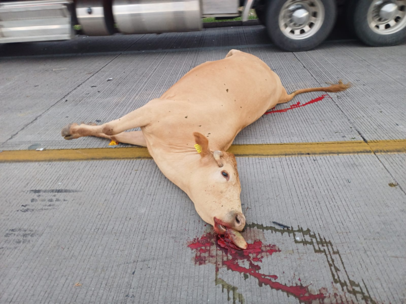 En el percance, una camioneta de la aseguradora GNP chocó con una de las reses, resultando en la muerte del animal y daños totales al vehículo. Afortunadamente, el conductor salió ileso, aunque el incidente pudo haber tenido consecuencias más graves.
