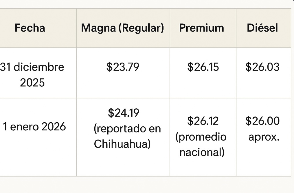 El precio de la gasolina en Chihuahua cerró el 31 de diciembre de 2025 en 23.79 pesos por litro la Magna y 26.15 la Premium, mientras que este 1 de enero de 2026 amaneció con un promedio nacional cercano a 24 pesos por litro, reflejando el ajuste anual del IEPS Reporte Í… +5.