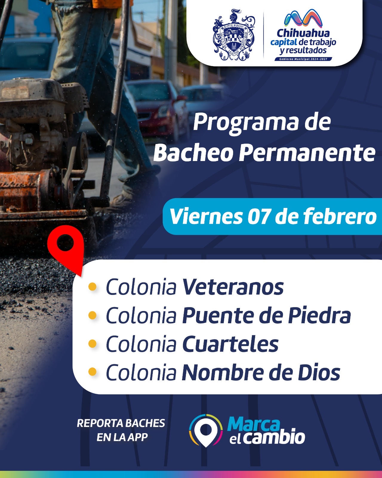 _*Chihuahua, Chih., a 7 de febrero de 2025.-*_ El Gobierno Municipal, a través de la Dirección de Obras Públicas, trabajará con bacheo este 7 de febrero en las colonias Veteranos, Puente de Piedra, Cuarteles y Nombre de Dios.