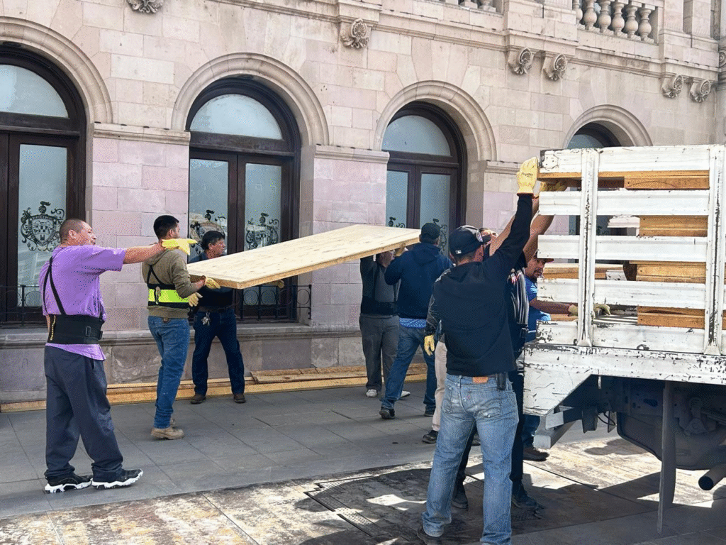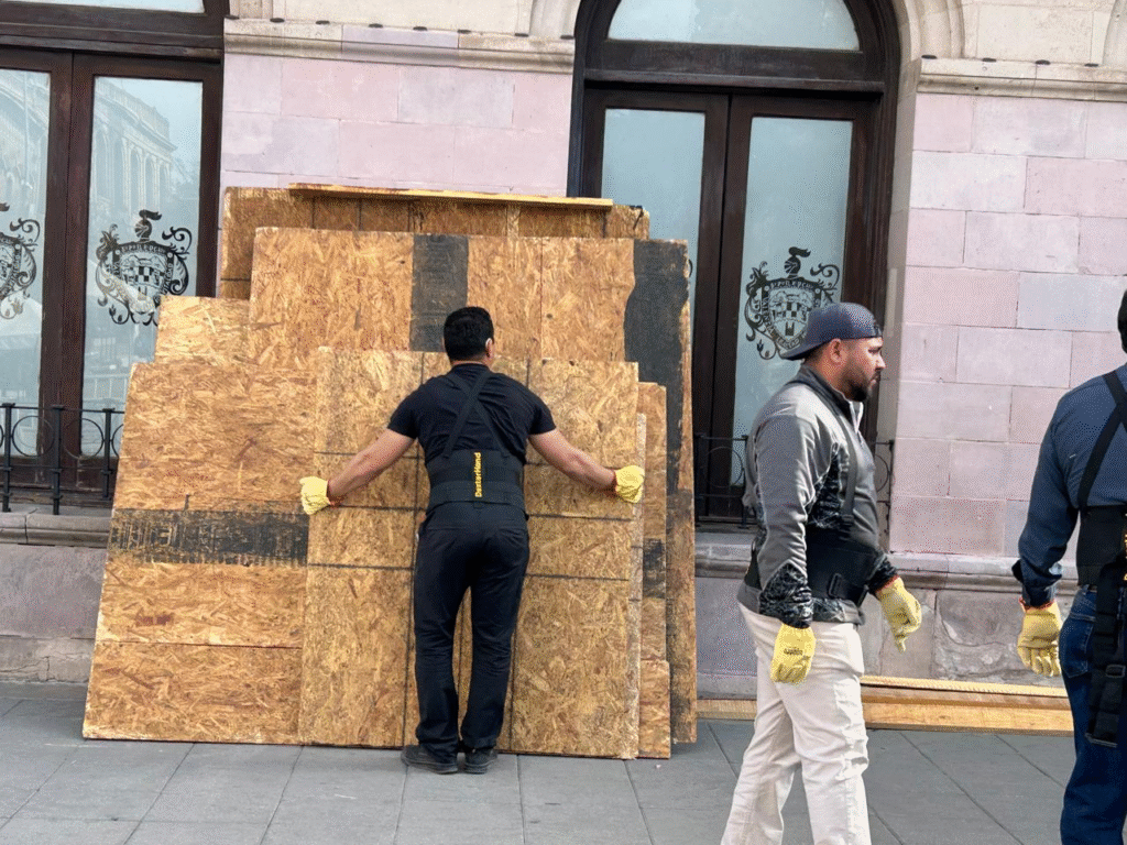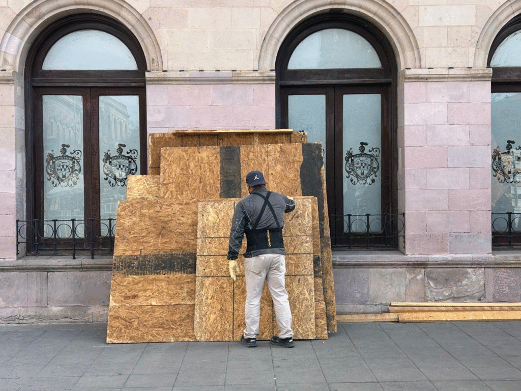 Desde tempranas horas se observó a cuadrillas instalar láminas de triplay sobre los ventanales del edificio, el cual recientemente fue objeto de trabajos de mantenimiento y pintura. Las estructuras buscan resguardar cristales y fachadas ante posibles daños durante la movilización, tomando como referencia situaciones ocurridas en años anteriores.