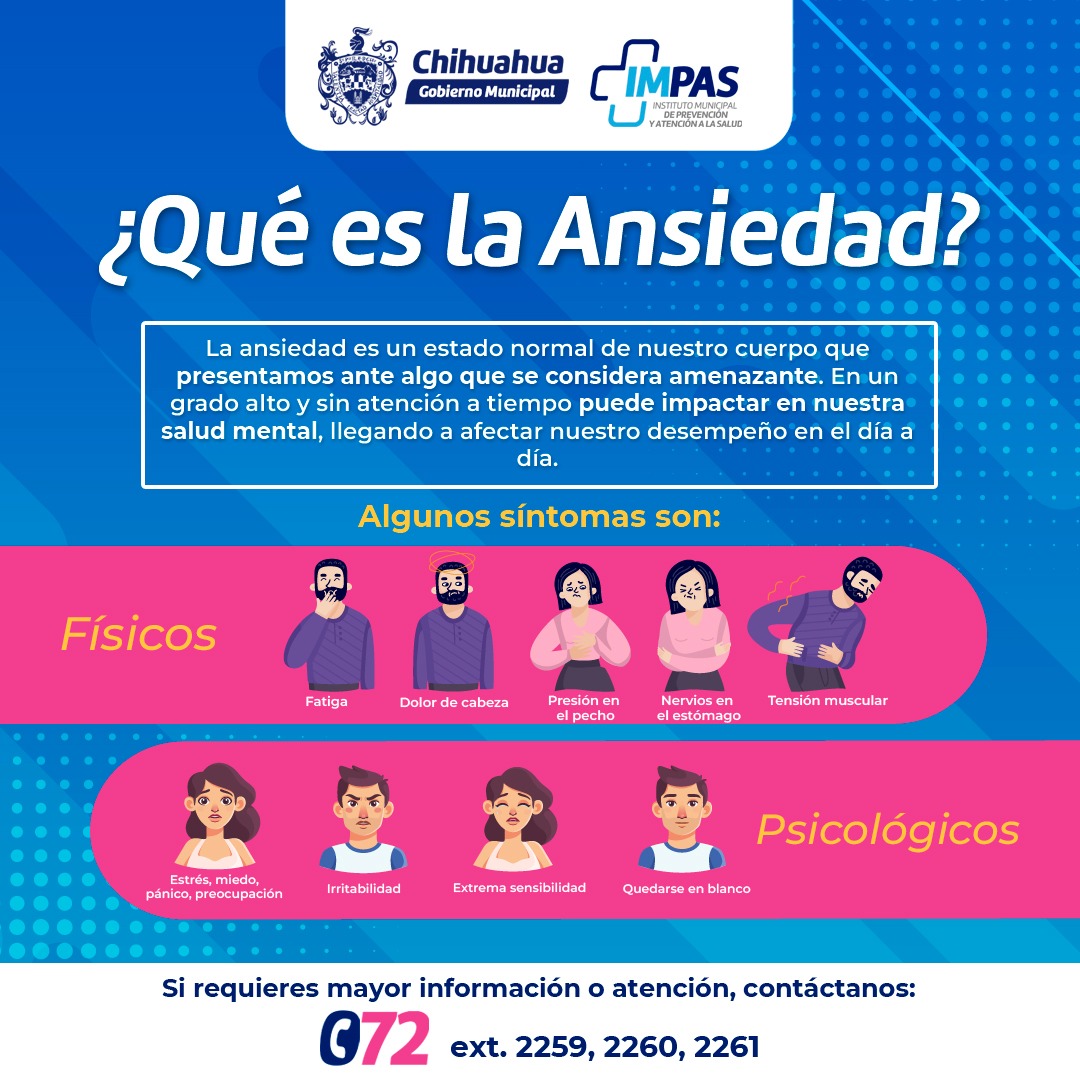 Chihuahua, Chih. A 25 de mayo de 2024.- El Gobierno Municipal de Chihuahua, a través del Instituto Municipal de Prevención y Atención a la Salud (IMPAS), exhorta a las y los chihuahuenses a conocer la información emitida por especialistas de la salud mental para identificar la ansiedad.