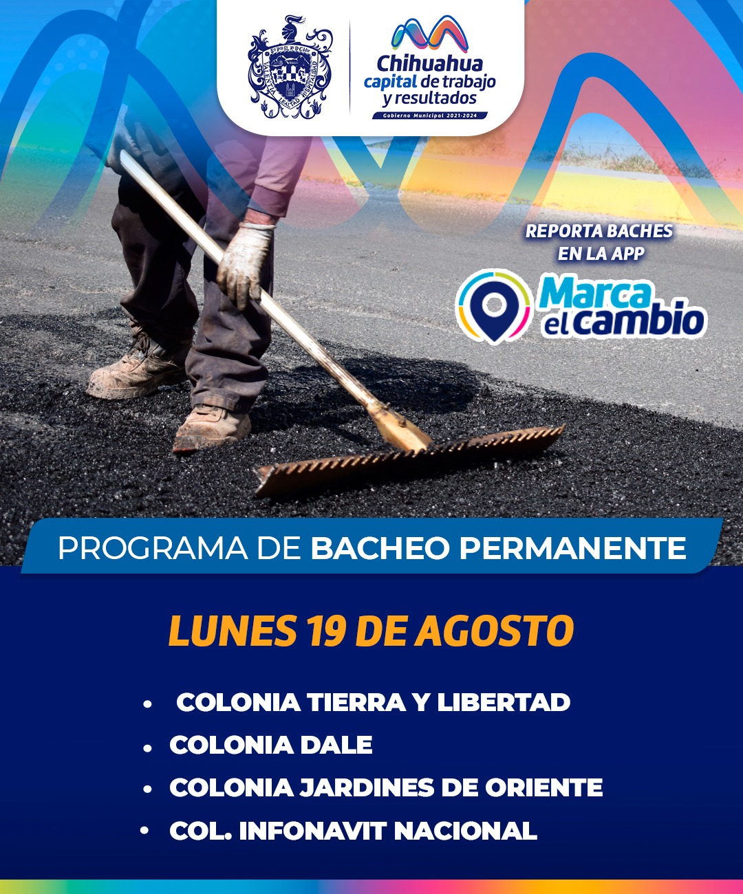 Chihuahua, Chih., a 19 de agosto de 2024.- El Gobierno Municipal, a través de la Dirección de Obras Públicas, continúa dando atención a los reportes que realizan los ciudadanos a través del Centro de Respuesta Ciudadana y en la aplicación Marca el Cambio, por lo que hoy trabajaran en las colonias Tierra y Libertad, Dale, Jardines de Oriente e Infonavit Nacional.