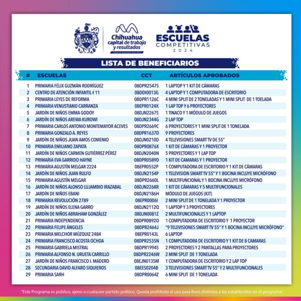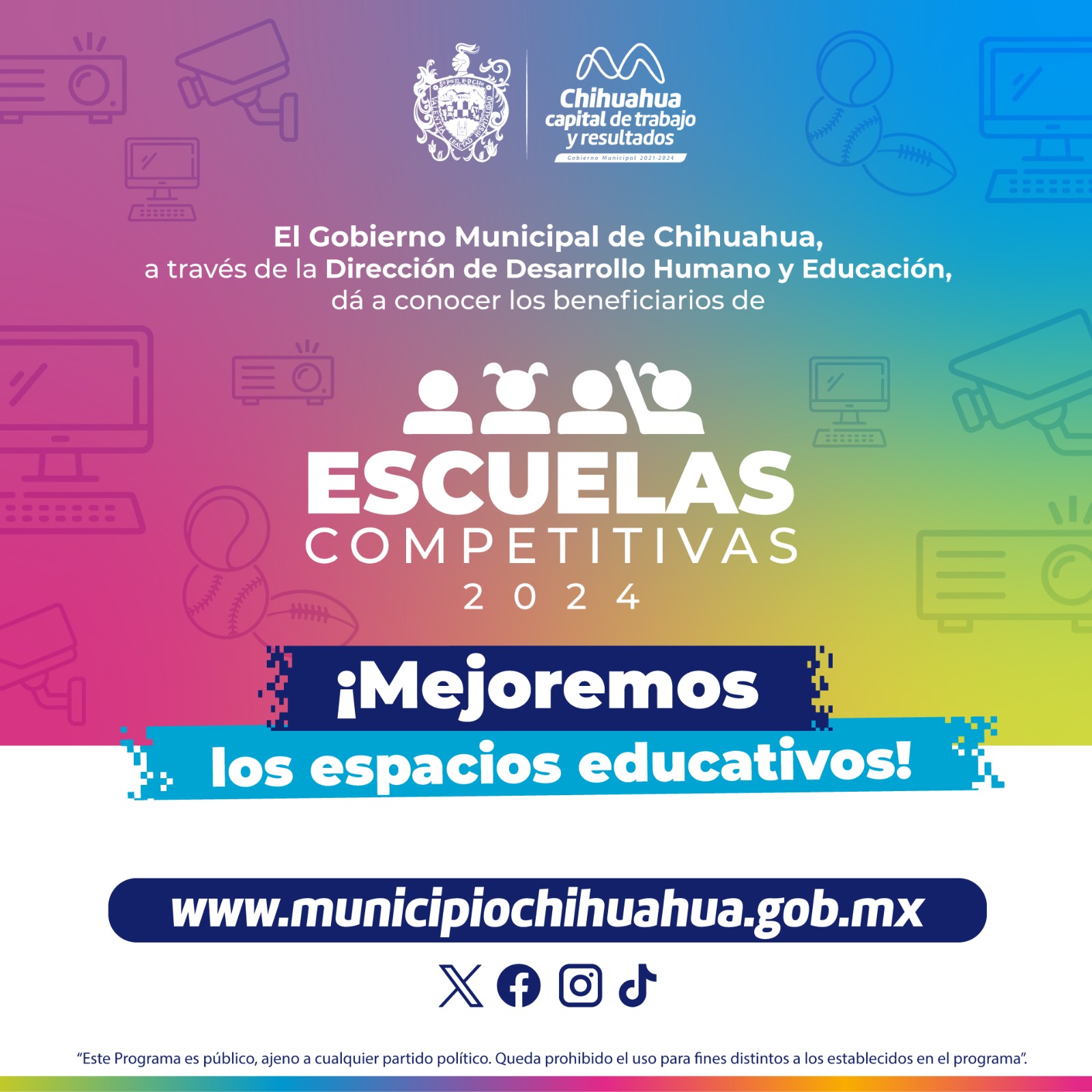 Chihuahua, Chih. A 1 de julio de 2024.- El Gobierno Municipal, a través de la Dirección de Desarrollo Humano y Educación, da a conocer la lista de escuelas que fueron aceptadas en el programa “Escuelas Competitivas” 2024, la cual se puede consultar en las redes sociales oficiales de Municipio.
