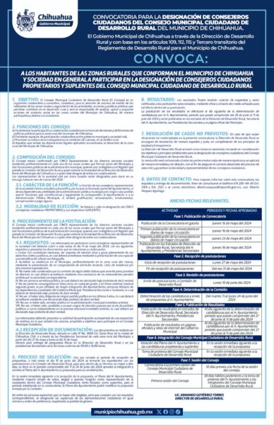 Chihuahua, Chih. A 16 de mayo de 2024.- El director de Desarrollo Rural, Armando Gutiérrez, dio a conocer la convocatoria para que las y los capitalinos sean parte del Consejo Municipal Ciudadano de Desarrollo Rural, la cual ya está disponible en la página del municipio hasta el 10 de junio.