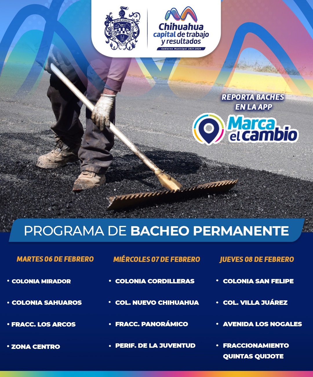 Chihuahua, Chih. A 06 de febrero de 2024.- El Gobierno Municipal, por medio de la Dirección de Obras Públicas, informa los puntos que tendrán trabajos de bacheo en la ciudad con el objetivo de dar atención a los reportes de los ciudadanos y brindar una mejor circulación vehicular.