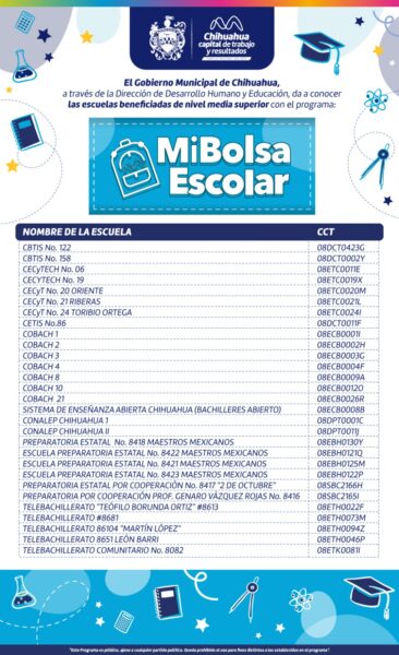 Chihuahua, Chih. A 25 de febrero de 2024.- Con el objetivo de contribuir a la economía de las familias del municipio de Chihuahua el Gobierno Municipal de Chihuahua a través de la Dirección de Desarrollo Humano y Educación da a conocer las escuelas públicas que serán beneficiadas con el programa “Mi Bolsa Escolar Chihuahua”.