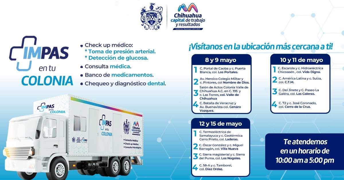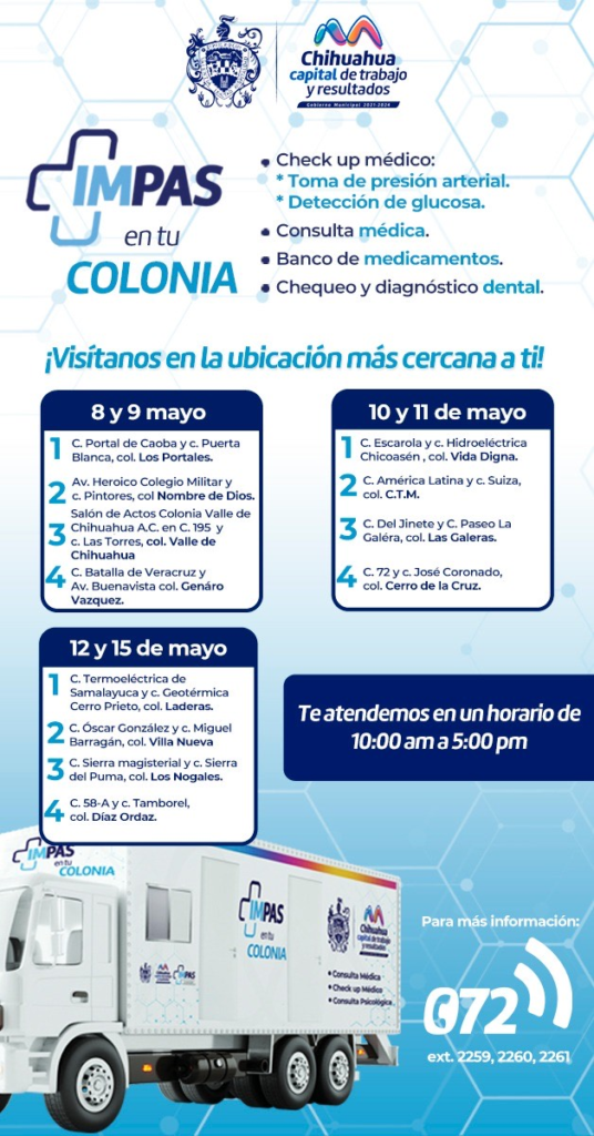 El Gobierno Municipal de Chihuahua, encabezado por el alcalde Marco Bonilla, ha lanzado una invitación a todas las familias de la Capital para que aprovechen los servicios gratuitos en los Consultorios Móviles del programa “IMPAS en Tu Colonia”. Esta iniciativa es llevada a cabo por el Instituto Municipal de Prevención y Atención a la Salud (IMPAS), con el objetivo de promover el cuidado de la salud de las y los chihuahuenses.