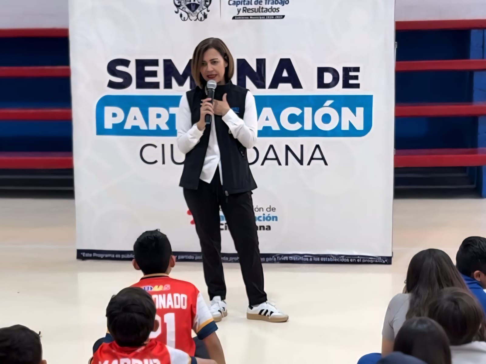 Convive regidora Isela Martínez con niñas y niños de la primaria Luis Urías Belderráin durante el Rally de Participación Ciudadana