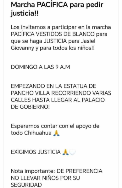 Los organizadores han hecho un llamado a la ciudadanía para que asistan vestidos de blanco, símbolo de paz y pureza, pero han enfatizado que, por motivos de seguridad, se recomienda no llevar a niños a la manifestación. La comunidad, unida en su dolor, ha expresado masivamente su repudio en redes sociales, donde el caso de Jasiel ha generado una ola de solidaridad.