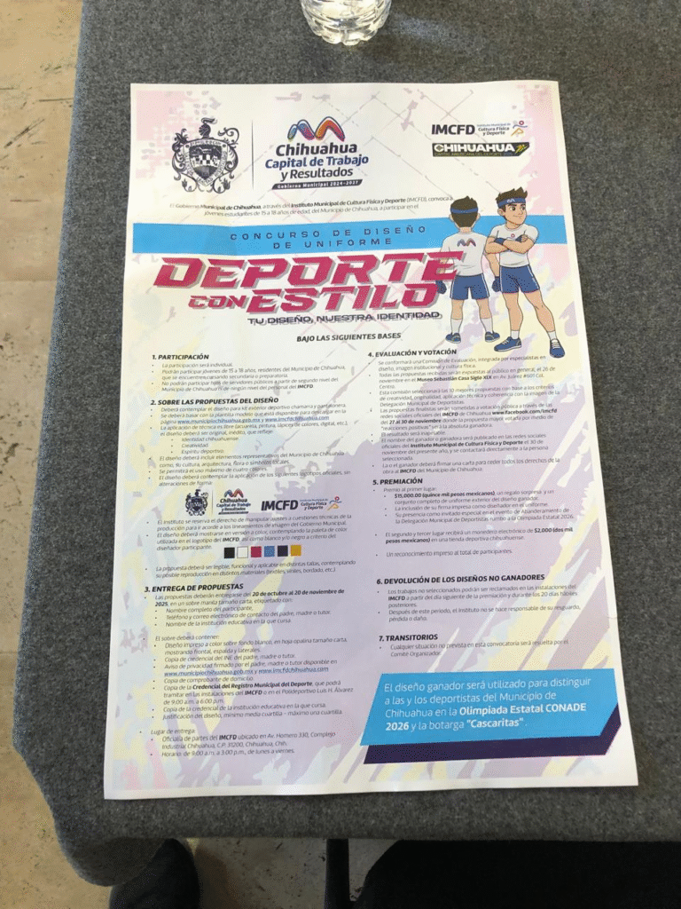 El Instituto Municipal de Cultura, Física y Deportes, junto con la Secretaría de Educación y Deportes del Gobierno del Estado, lanzó una convocatoria para que estudiantes de 15 a 18 años diseñen el uniforme que usarán los atletas de la delegación municipal en la Olimpia Estatal 2026. El concurso “Deporte con Estilo” busca fomentar la creatividad juvenil y vincular el arte con la identidad deportiva de Chihuahua.