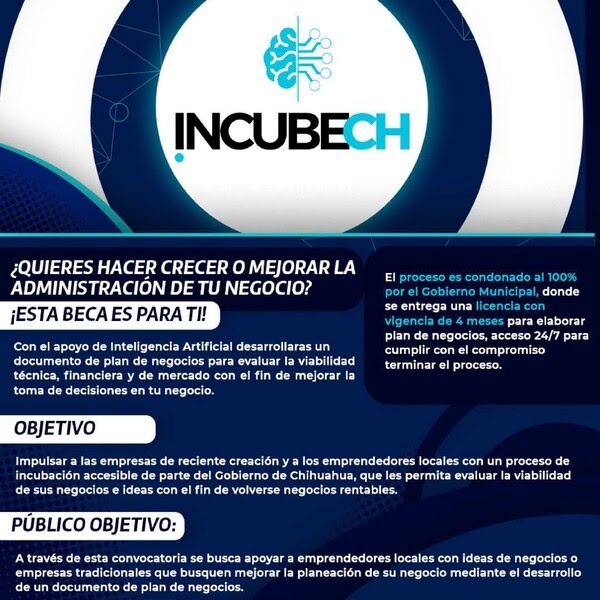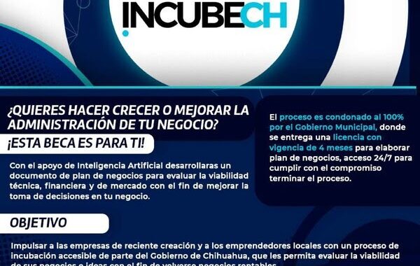 Para consultar la convocatoria completa, ingresa al siguiente link para conocer las bases: https://www.municipiochihuahua.gob.mx/CCS/Convocatorias/Convocatoria_Beca_INCUBECH. Y para coordinar una cita, puedes comunicarte al 614-200-48-00, extensión 2957 o al correo electrónico: incubechihuahua@gmail.com.