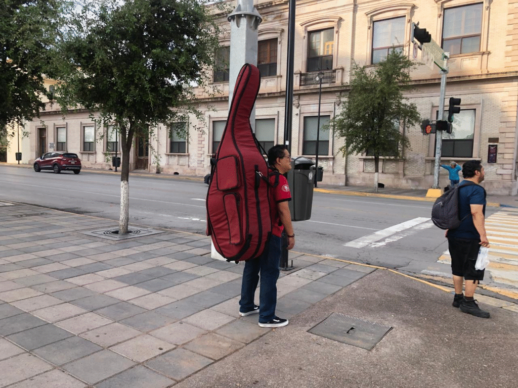 Esta mañana en el centro de la ciudad, en la Plaza La cabalgata de Pancho Villa, se pudo observar una escena que captó la atención de varios. Un músico cargaba un instrumento de gran tamaño a su espalda. El instrumento, casi tan grande como el propio artista, recordaba a todos la famosa frase: “cuando la herramienta es más grande que tú”.