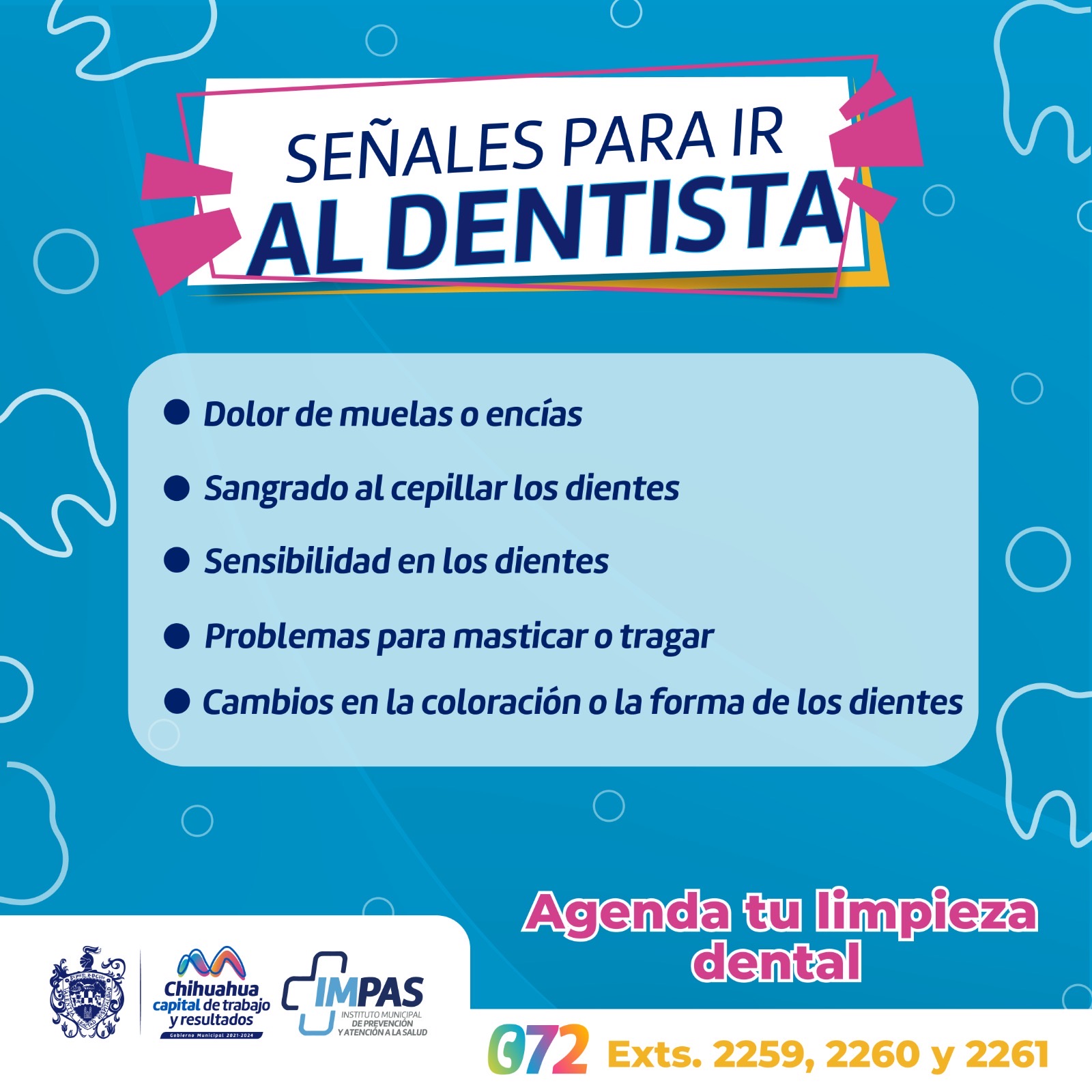 ***. Chihuahua, Chih., a 13 de enero de 2025.-*_ El Gobierno Municipal, a través del Instituto Municipal de Prevención y Atención a la Salud (IMPAS), comparte algunas señales para identificar cuando acudir a consulta dental.
