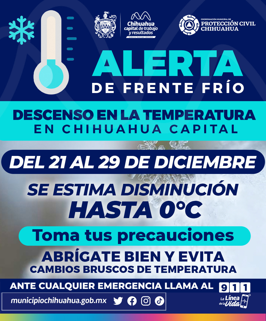 Chihuahua, Chih. A 22 de diciembre de 2023.- La Coordinación Municipal de Protección Civil, informa que este fin de semana, del 22 al 24 de diciembre, se prevén un gran descenso en las temperaturas con mínimas de 3°C, por lo que exhortan a seguir las recomendaciones que emiten las autoridades para evitar enfermedades respiratorias.