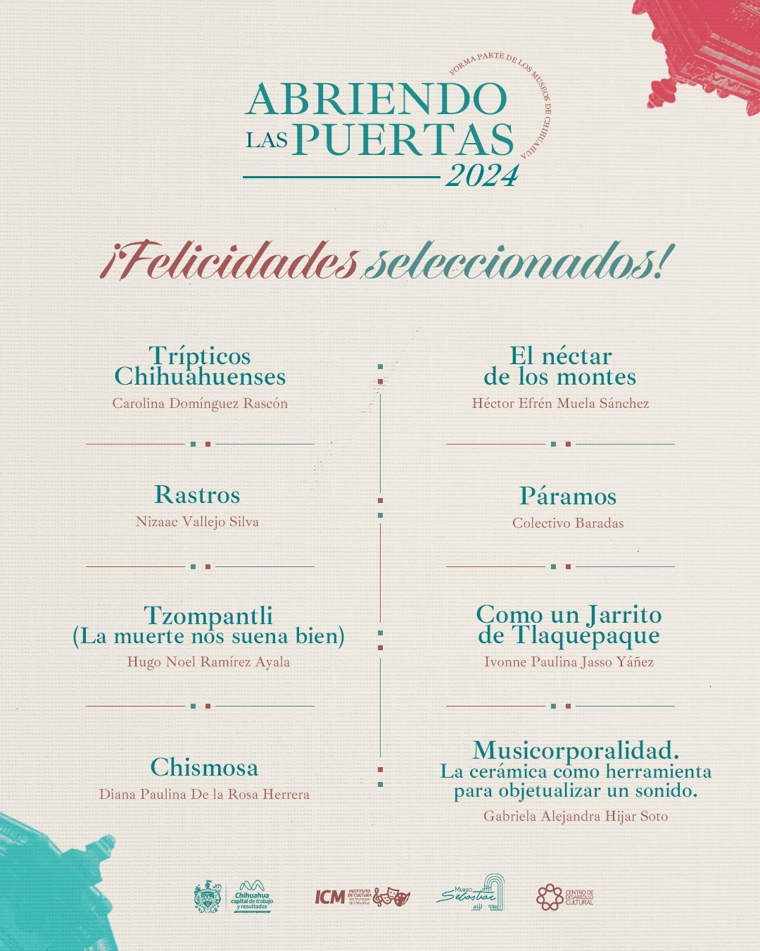Chihuahua, Chih. A 26 de febrero de 2024.- El Instituto de Cultura del Municipio de Chihuahua, da a conocer la lista de seleccionados de la convocatoria “Abriendo las Puertas 2024”, quienes tendrán la oportunidad de exhibir sus obras en los museos municipales de la ciudad.