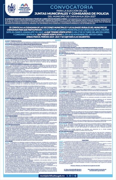 Chihuahua, Chih. A 27 de septiembre de 2024.- El Gobierno Municipal de Chihuahua, a través de la Dirección de Desarrollo Rural, ha emitido la convocatoria para la elección de las Juntas Municipales y Comisarías de Policía del municipio para el periodo 2024-2027. Esta convocatoria está dirigida a la ciudadanía de las secciones municipales y localidades rurales del municipio.