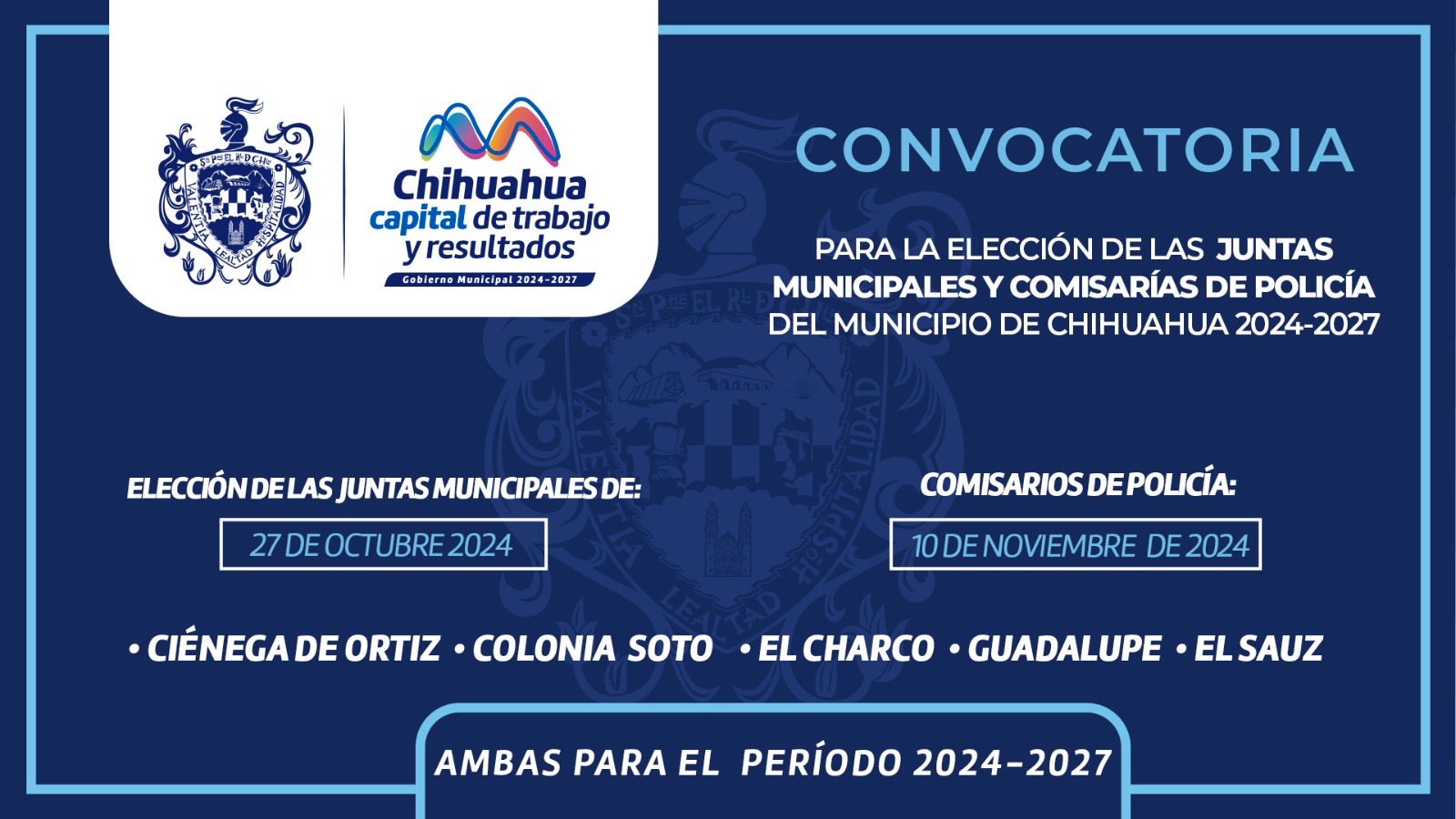 Chihuahua, Chih. A 27 de septiembre de 2024.- El Gobierno Municipal de Chihuahua, a través de la Dirección de Desarrollo Rural, ha emitido la convocatoria para la elección de las Juntas Municipales y Comisarías de Policía del municipio para el periodo 2024-2027. Esta convocatoria está dirigida a la ciudadanía de las secciones municipales y localidades rurales del municipio.