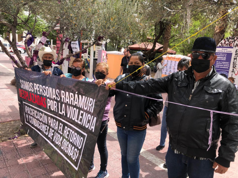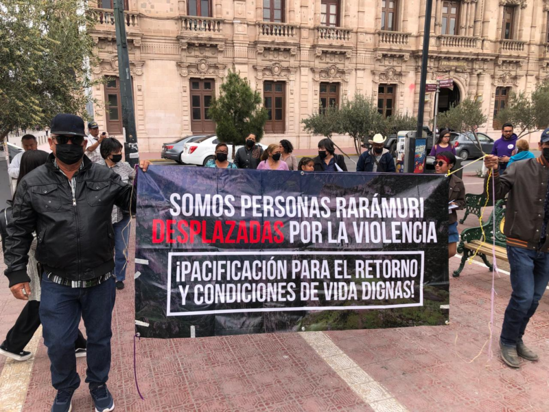 Hoy, frente al Palacio de Gobierno en Chihuahua, un grupo de personas provenientes de diversas comunidades de la sierra del estado se congregaron para exigir atención a su situación de desplazamiento forzado debido a la violencia perpetrada por la delincuencia organizada.