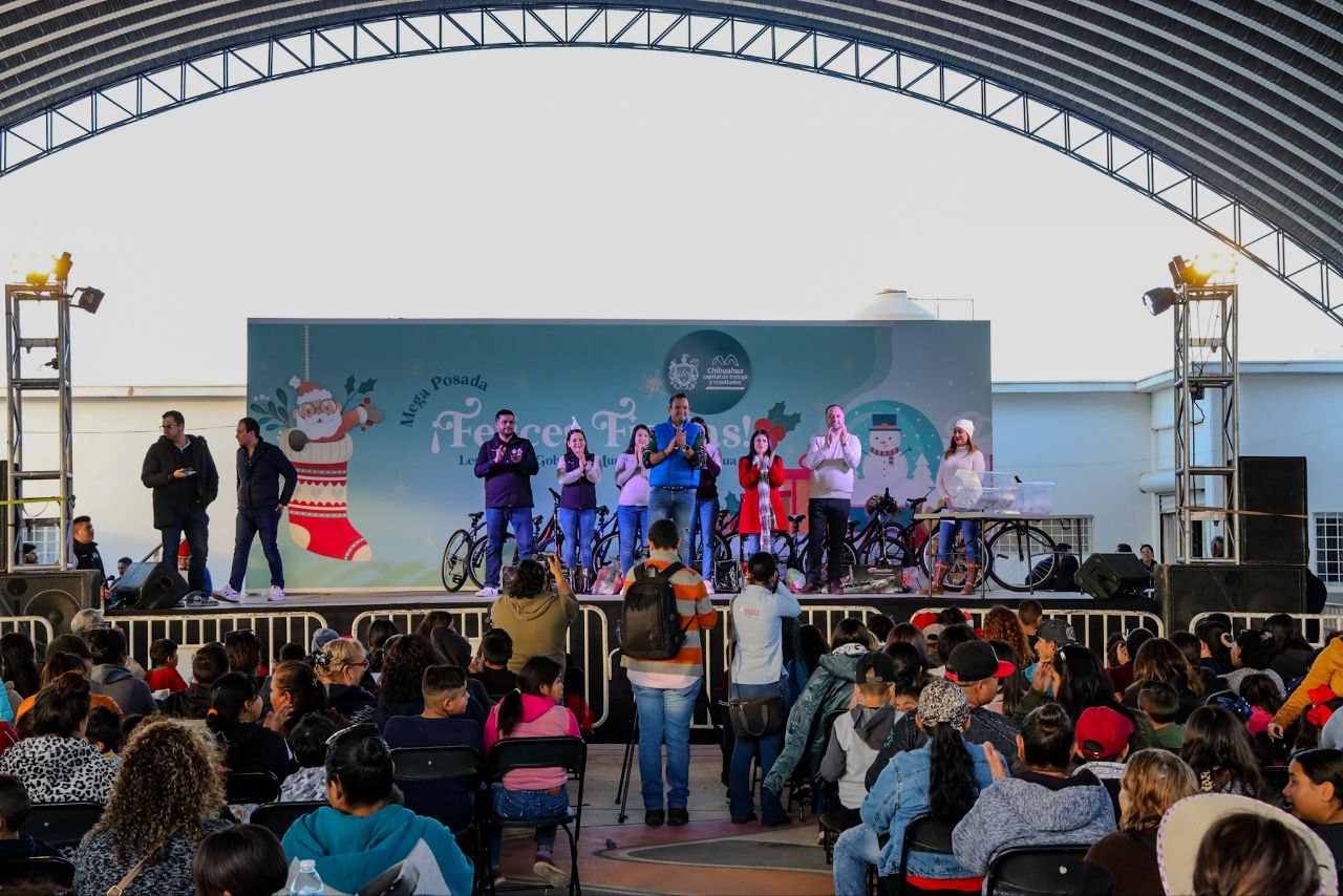 Chihuahua, Chih. A 21 de diciembre de 2023.- El alcalde de Chihuahua, Marco Bonilla y la presidenta del DIF Municipal, Karina Olivas, compartieron un momento de alegría con las familias que viven en los alrededores del Centro de Desarrollo Familiar (CEDEFAM) Valle Dorado, en una posada navideña.