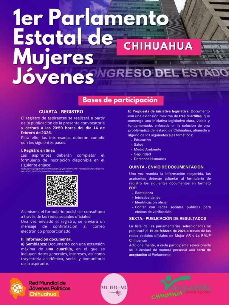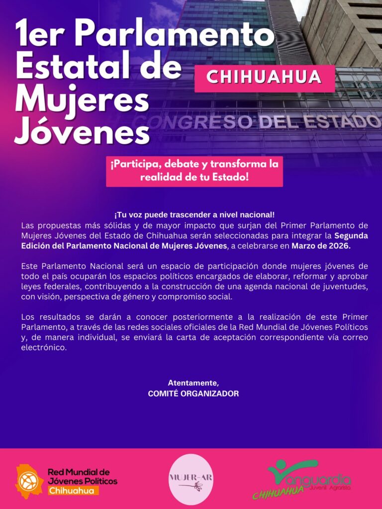 El evento coincidió con la convocatoria abierta para el 1er Parlamento Estatal de Mujeres Jóvenes, impulsado por la Red Municipal de Jóvenes Políticos de Chihuahua, Mujer-AR y Vanguardia Juvenil Agrarista, que busca fomentar la participación de jóvenes entre 18 y 29 años en la vida pública y legislativa, con enfoque en perspectiva de género y derechos humanos. Las interesadas podrán registrar sus propuestas hasta el 14 de febrero, y las seleccionadas formarán parte de la Segunda Edición del Parlamento Nacional de Mujeres Jóvenes, a celebrarse en marzo. La sesión inaugural de este parlamento estatal se llevó a cabo este viernes 27 de febrero en las instalaciones del Congreso del Estado, a partir de las 10:00 horas.
