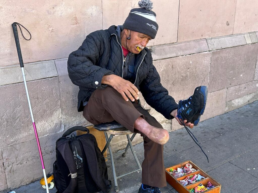 Roberto Muñoz Lara explicó que la lesión en su pierna derecha derivó en la amputación de los dedos y el pie para evitar complicaciones mayores. Desde entonces utiliza bastón y permanece sentado mientras vende mazapanes, paletas, chicles y otros dulces en la zona.