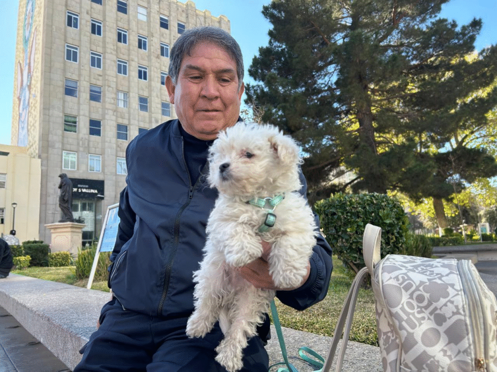 “Lo sacamos para que vaya acostumbrándose”, comentó durante la entrevista, mientras sostenía la correa que mantiene seguro al cachorro. Aunque Duque aún es muy pequeño, ya comienza a seguir a sus dueños en sus recorridos, siempre bajo supervisión.