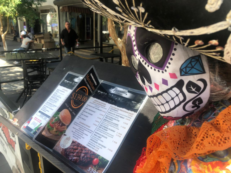 Un ejemplo de esta transformación es la catrina que adorna la entrada del restaurante bar La Presidencia, ubicado a un costado de la Presidencia Municipal sobre la calle Victoria. Esta figura, tradicional del Día de Muertos, combina elementos culturales con un toque moderno, siendo un claro símbolo de la fusión entre las celebraciones de Halloween y las tradiciones mexicanas en la ciudad.
