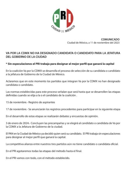El comunicado también señala que el PRI “está abierto al diálogo con los demás partidos políticos para construir una candidatura competitiva y ganadora”.