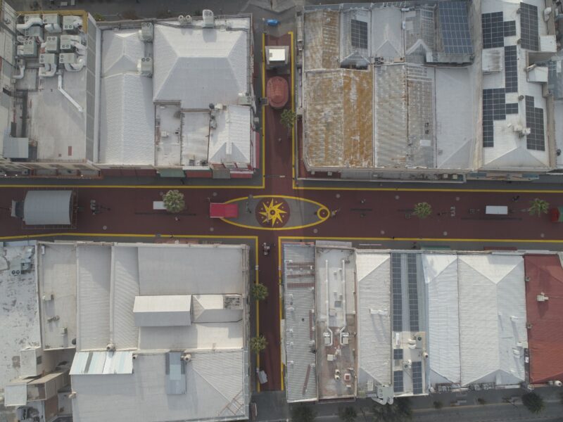 El retoque se realizó con los colores rojo óxido y amarrillo, los cuales, se seleccionaron conforme a los que ya se tenían en el área antes mencionada, por lo que se cubrió un estimado de 5,780 metros cuadrados entre las calles antes señaladas.