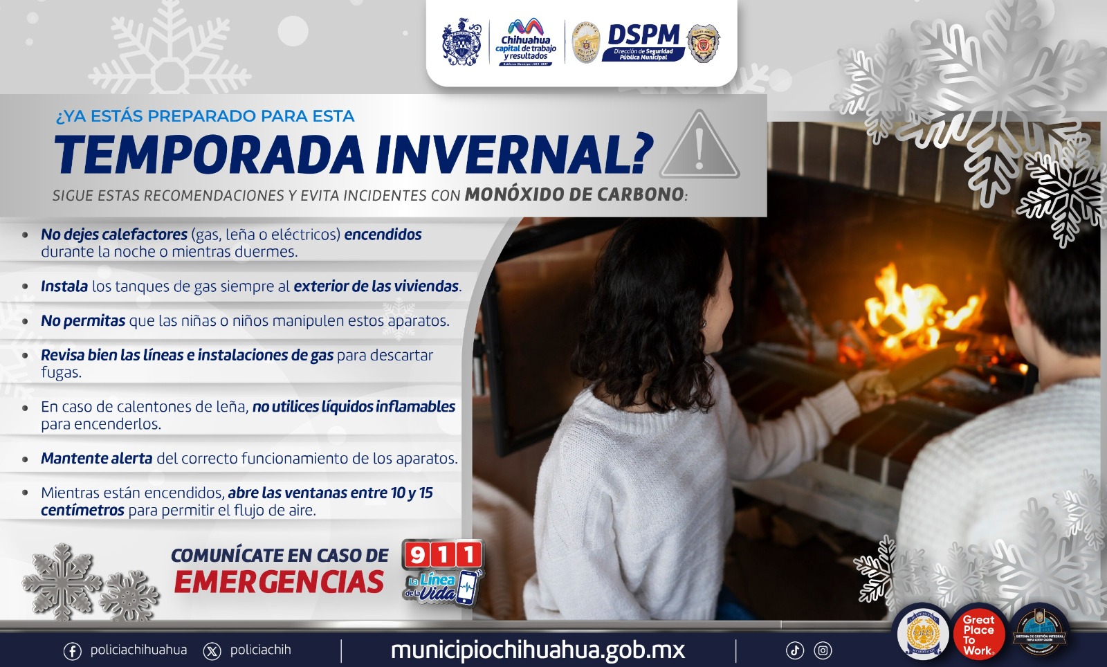 Chihuahua, Chih., a 5 de noviembre de 2024.- Debido a la entrada de los primeros frentes fríos en la ciudad que traen consigo descensos en la temperatura, el Heroico Cuerpo de Bomberos emite recomendaciones para evitar intoxicaciones por monóxido de carbono, especialmente entre quienes utilizan calefactores a gas, leña u otros que generan esta sustancia.