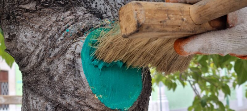 9.- Para finalizar la poda, colocar pintura con canela o bien fungicida, en los cortes realizados apoyados de una brocha.