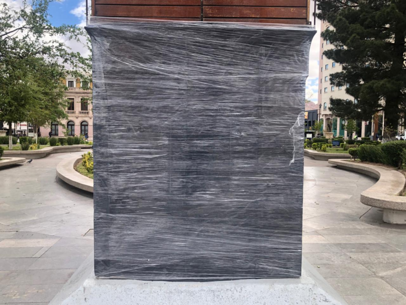 Hoy, en la Plaza de Armas frente a la catedral de Chihuahua, se pudo observar cómo se colocó un hule emplaye alrededor de la estructura de la base para protegerla durante el proceso de restauración.