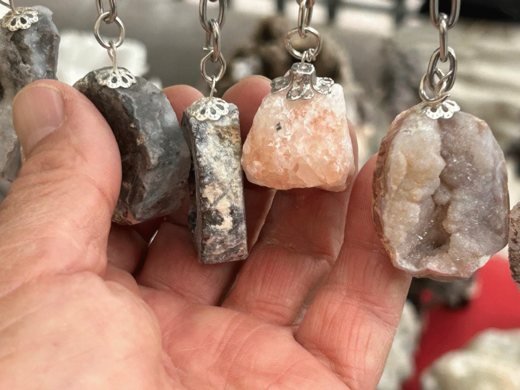 “Son minerales de todo el estado y traemos material de Santa Eulalia”, explicó Esparza, quien destacó que los precios varían según la pieza: desde 50 pesos hasta 3,000 pesos, dependiendo de su tamaño, rareza y calidad. Entre sus productos más accesibles se encuentran llaveros tallados en piedra, disponibles por 50 pesos, y figuras artesanales como arbolitos de mineral.