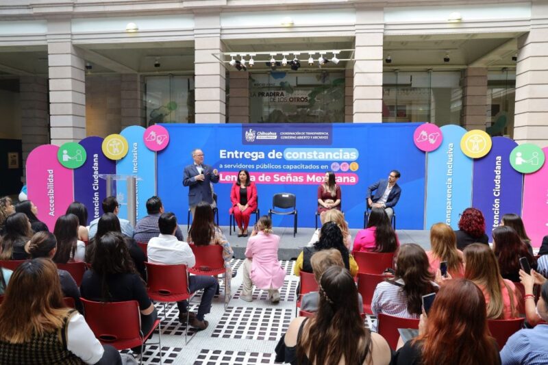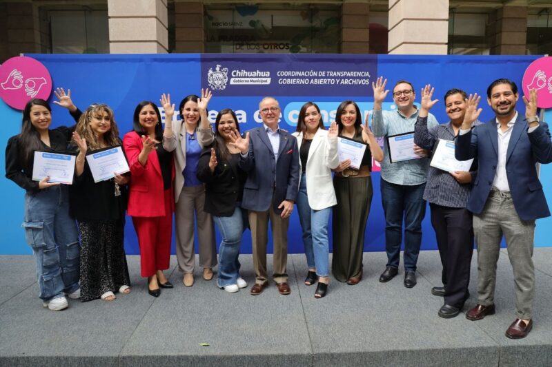 Chihuahua, Chih. A 17 de abril de 2024.- El alcalde de Chihuahua, Jorge Cruz Russek, encabezó la entrega de constancias en “Lengua de Señas Mexicana” a 130 servidores públicos, quienes fueron capacitados para brindar una mejor atención a personas con discapacidad auditiva, garantizando con ello un trato digno y el derecho de acceso a información pública.