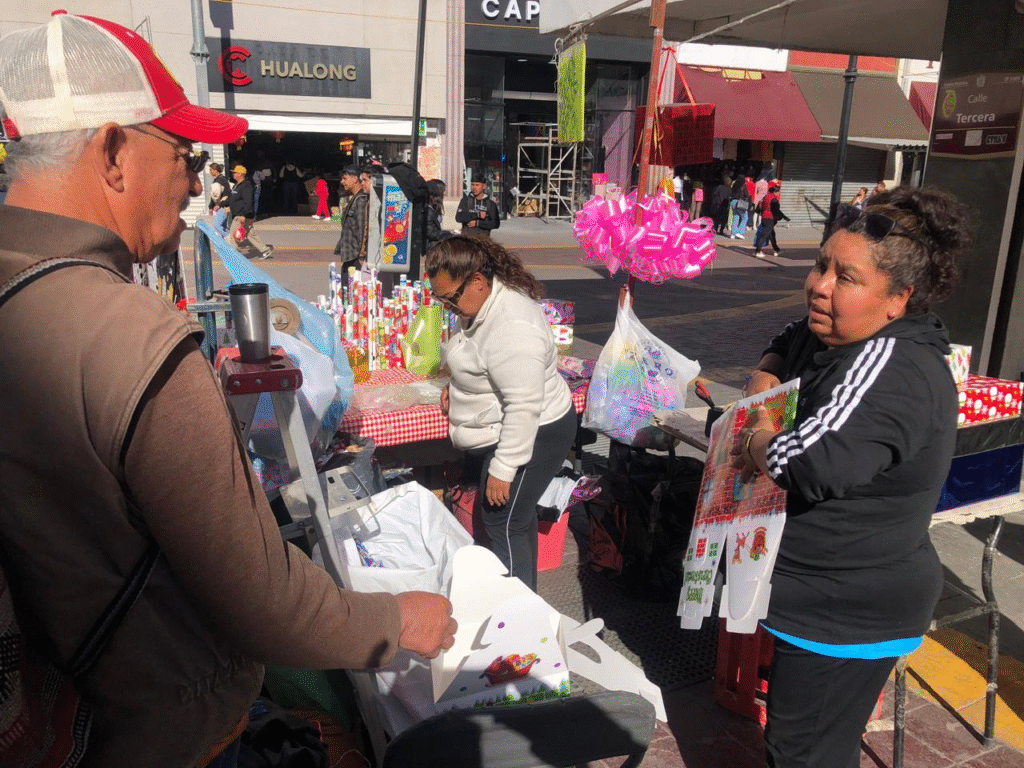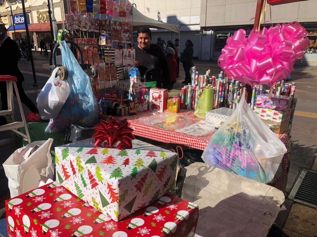 En la esquina de Libertad y Tercera, Lorena Frago y su equipo trabajan contra reloj para atender a quienes buscan dar un toque especial a sus regalos navideños. Con papel de regalo desde 25 pesos, bolsas desde 15 y moños de todos los colores, su puesto se ha convertido en un aliado para quienes quieren ahorrar sin sacrificar la presentación.