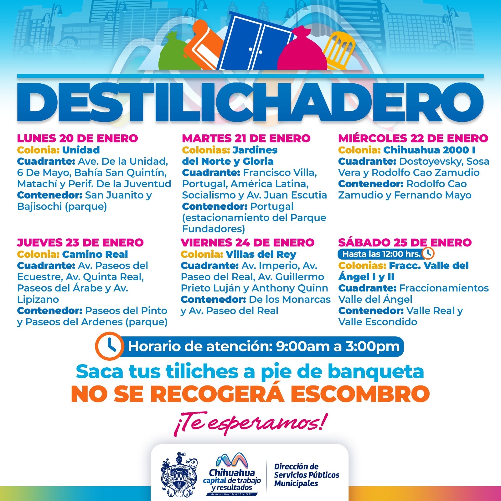 _*Chihuahua, Chih., a 18 de enero de 2025.-*_ Para evitar acumulaciones de basura de grandes dimensiones en las viviendas, que podría generar plagas o problemas de salud, el Gobierno Municipal, a través de la Dirección de Servicios Públicos Municipales, informa el calendario del programa Destilichadero, que se realizará del 20 al 25 de enero en ocho colonias de la Capital.
