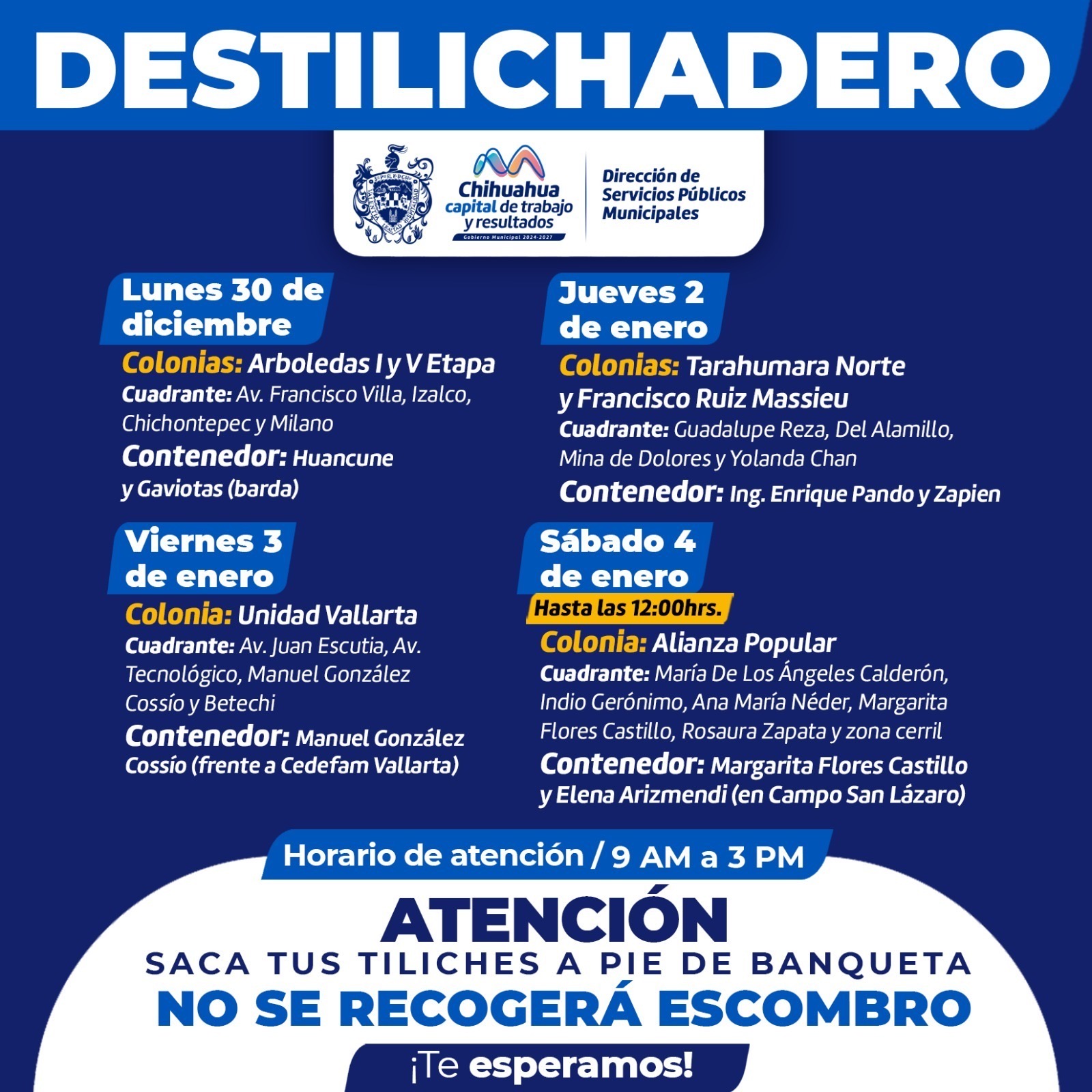 ***Chihuahua, Chih., a 28 de diciembre de 2024.-*_ Para evitar acumulaciones de basura de grandes dimensiones en las viviendas, que podría generar plagas o problemas de salud, el Gobierno Municipal, a través de la Dirección de Servicios Públicos Municipales, informa el calendario del programa Destilichadero, que se realizará del 30 de diciembre al 4 de enero en seis colonias de la Capital.