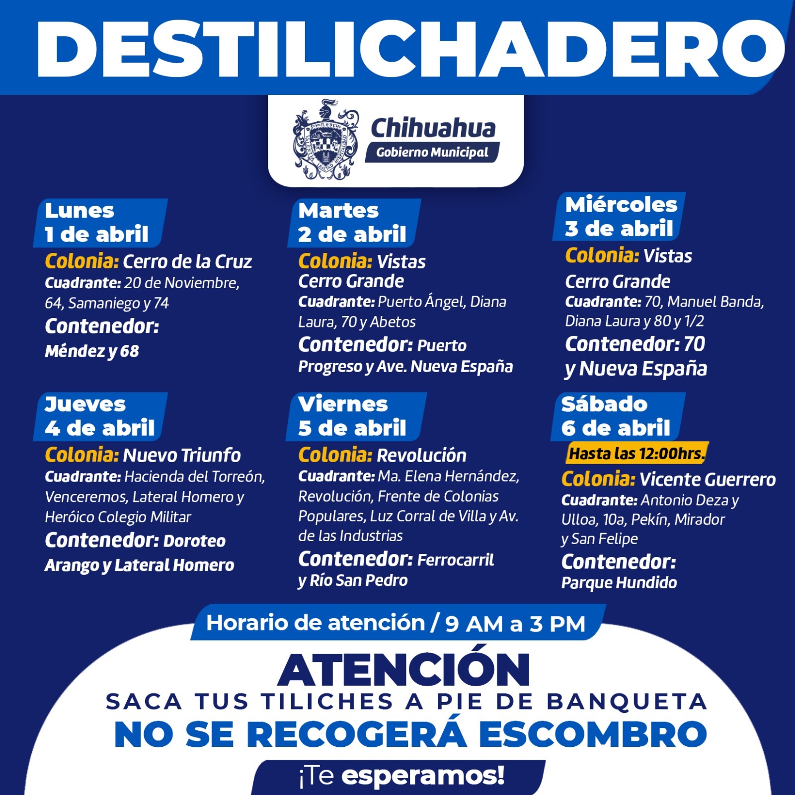 Chihuahua, Chih., 30 de marzo de 2024.-* Para evitar acumulación de basura de grandes dimensiones en viviendas, lo cual podría generar plagas o problemáticas en la salud, el Gobierno Municipal, a través de la Dirección de Servicios Públicos Municipales, informa el calendario del programa Destilichadero, que se realizará del 1 al 6 de abril en cinco colonias de la Capital.