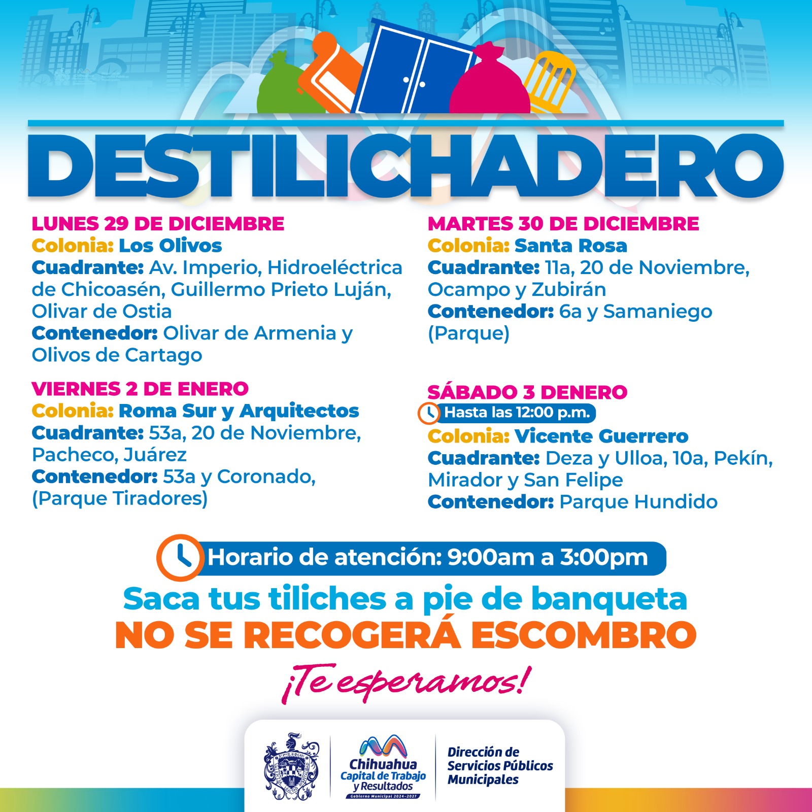 H. Ciudad de Chihuahua, Chih., a 27 de diciembre de 2025.- Para evitar acumulaciones de basura de grandes dimensiones en las viviendas, que podría generar plagas o problemas de salud, el Gobierno Municipal, a través de la Dirección de Servicios Públicos Municipales, informa el calendario del programa Destilichadero, que se realizará en 5 colonias de la capital del 29 de diciembre al 3 de enero
