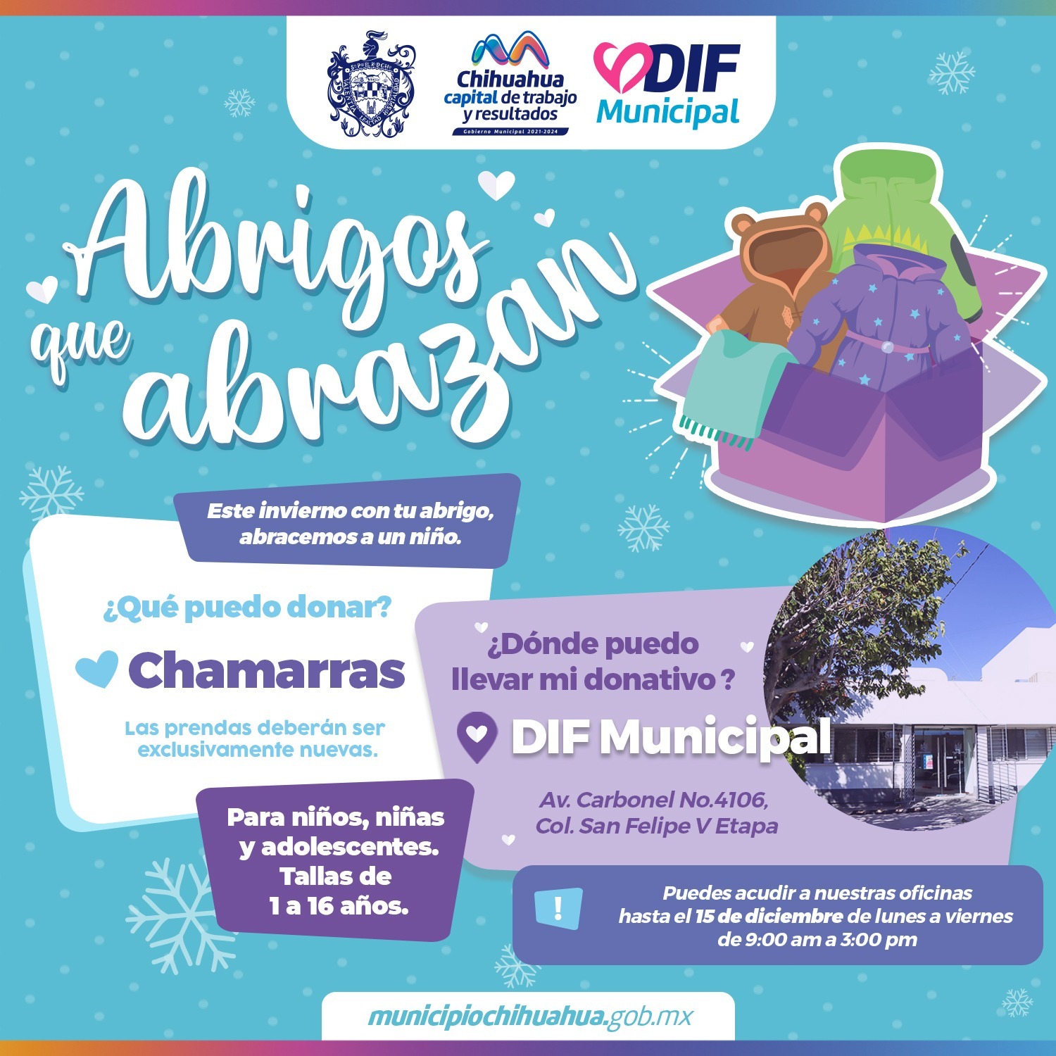 Chihuahua, Chih. A 11 de diciembre de 2023.- Bajo el compromiso del alcalde Marco Bonilla y la presidenta del DIF Municipal, Karina Olivas, de dignificar a niñas, niños y adolescentes (NNA), el Gobierno Municipal informa que la campaña invernal: “Abrigos que abrazan” finaliza este 15 de diciembre.
