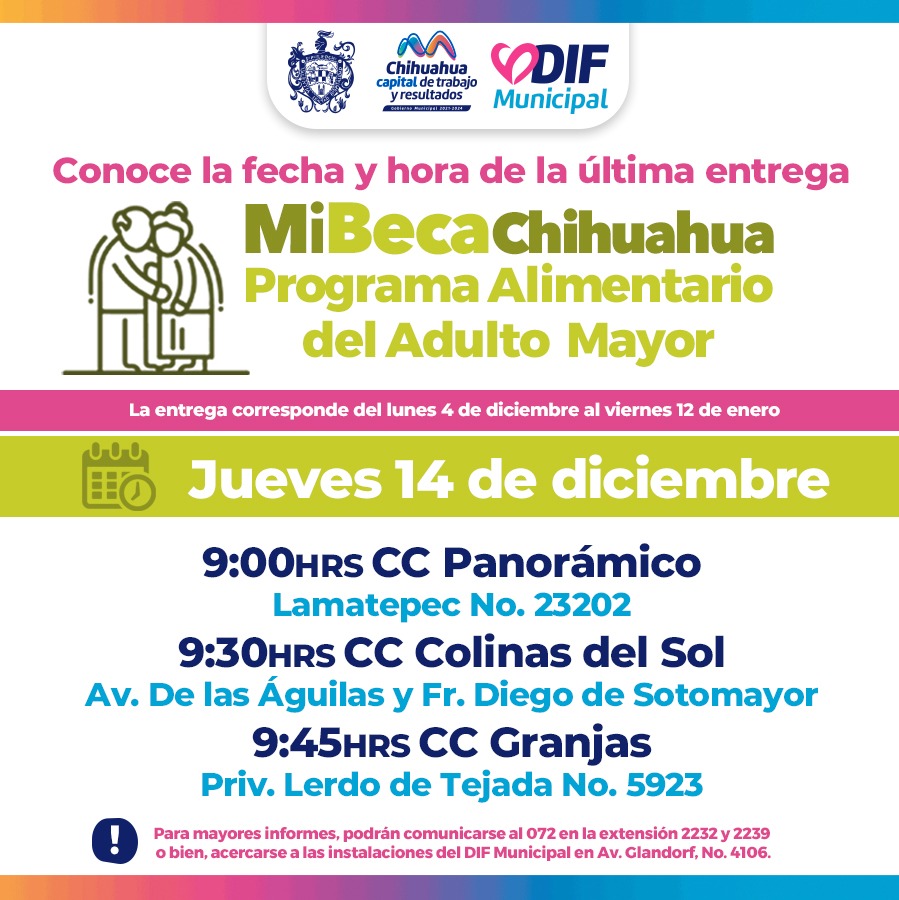 Chihuahua, Chih. A 13 de diciembre de 2023.- En atención al compromiso que el alcalde, Marco Bonilla, tiene con las y los adultos mayores de Chihuahua Capital, para garantizarles una mejor calidad de vida, el Gobierno Municipal, a través del DIF, informa que este jueves 14 de diciembre, las y los beneficiarios del Programa Alimentario del Adulto Mayor (PAAM) podrán acudir por su apoyo alimentario a los centros comunitarios:
