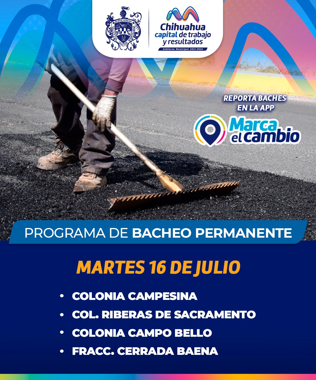 Chihuahua, Chih. A 16 de julio de 2024.- Para mantener las calles y avenidas de la capital en óptimas condiciones para la circulación vehicular y peatonal, el Gobierno Municipal encabezado por el alcalde Marco Bonilla, realizará trabajos de bacheo en las colonias Campesina, Riberas de Sacramento, Campo Bello y en fraccionamiento Cerrada Baena.