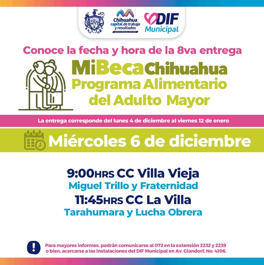 El Gobierno Municipal que preside el alcalde Marco Bonilla, por medio del DIF, informa que este miércoles 6 de diciembre, las y los beneficiarios del Programa Alimentario del Adulto Mayor (PAAM) podrán acudir por su apoyo alimentario a los centros comunitarios Villa Vieja, a las 9:00 am y La Villa, a las 11:45 am.