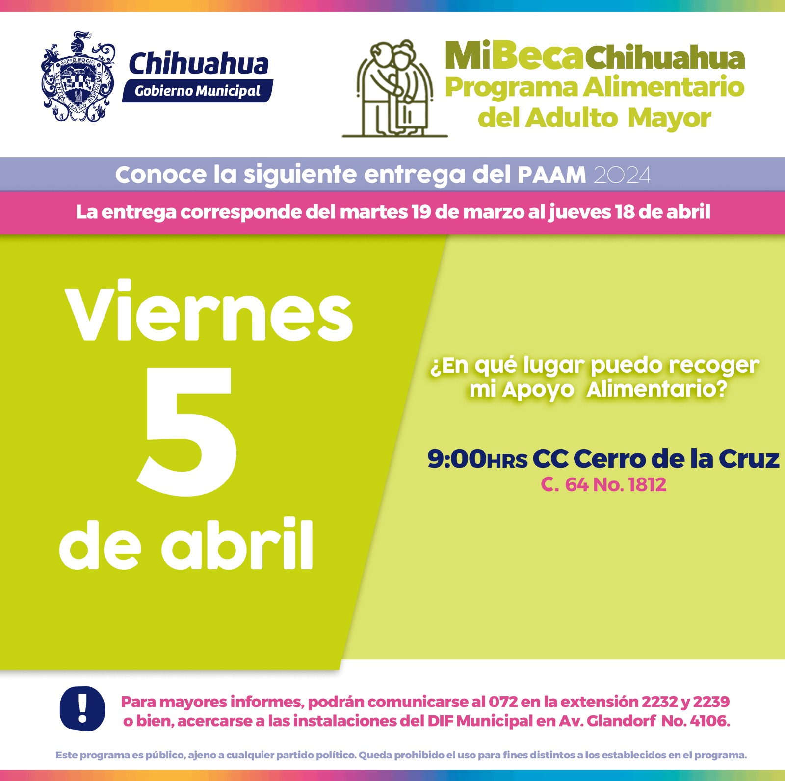 Chihuahua, Chih. A 4 de abril de 2024.- El Gobierno Municipal, a través del DIF, informa a las y los seleccionados del Programa Alimentario del Adulto Mayor (PAAM) que podrán acudir por su paquete alimentario este viernes 5 de abril en el centro comunitario Cerro de la Cruz, a las 9:00 horas.