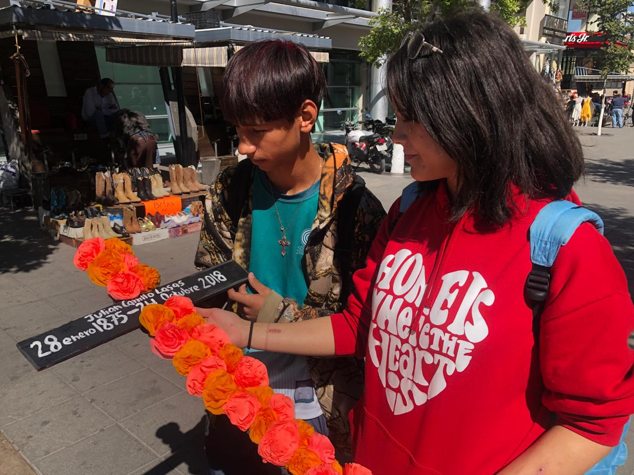 Valeria y Víctor Ariel, dos de los estudiantes, explicaron que su trabajo está dedicado a Julián Carrillo Lazos, un defensor de los derechos indígenas nacido el 28 de enero y asesinado el 24 de octubre. “Lo mataron por defender a su comunidad”, comentaron, mientras mostraron la cruz que elaboraron como símbolo de respeto y memoria.