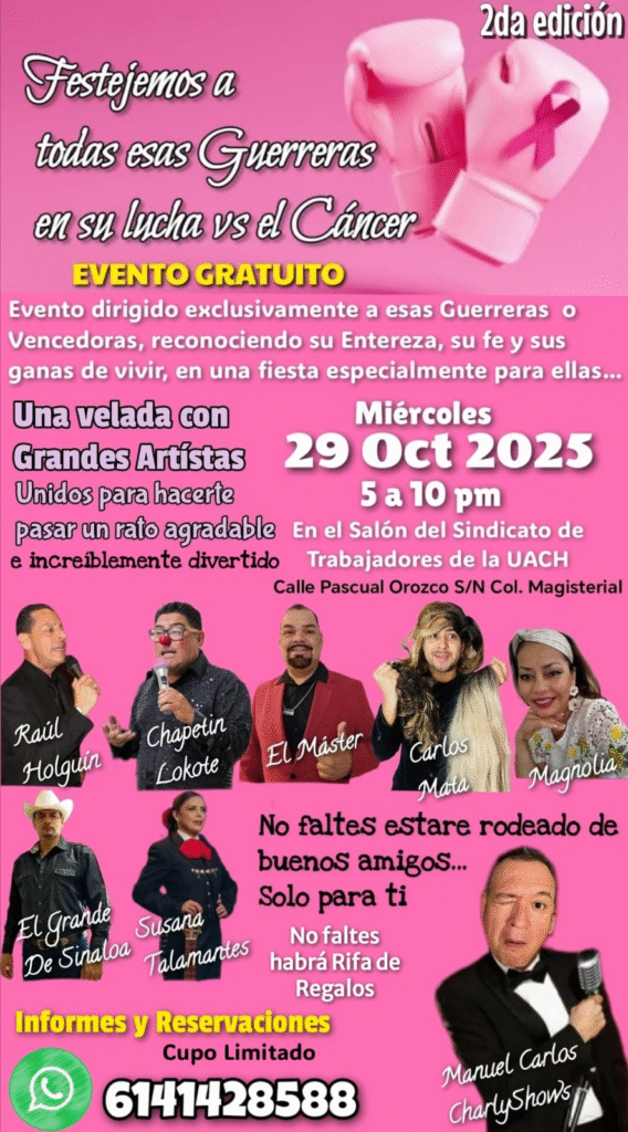 El evento contará con la participación de comediantes, cantantes y artistas invitados, quienes ofrecerán su talento de manera generosa para celebrar la vida y la fortaleza de estas mujeres. “Queremos que sea una tarde llena de emociones positivas, donde cada asistente se sienta reconocida y acompañada en su lucha o victoria contra el cáncer”, explicó Manuel Carlos, representante de CharlyShows y organizador del evento.