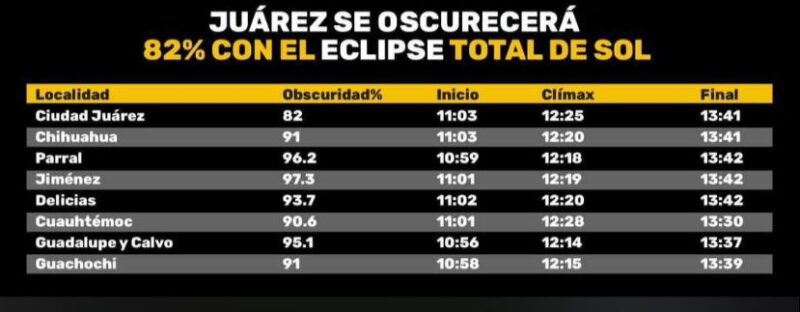 Cabe mencionar que para el municipio de Chihuahua se espera un oscurecimiento del 90.94%, con una duración de 2 horas 38 minutos y 14 segundos. Iniciará a las 11:03:06 hora, su punto máximo será a las 12:20:32 y finalizará a las 13:41:20 horas.