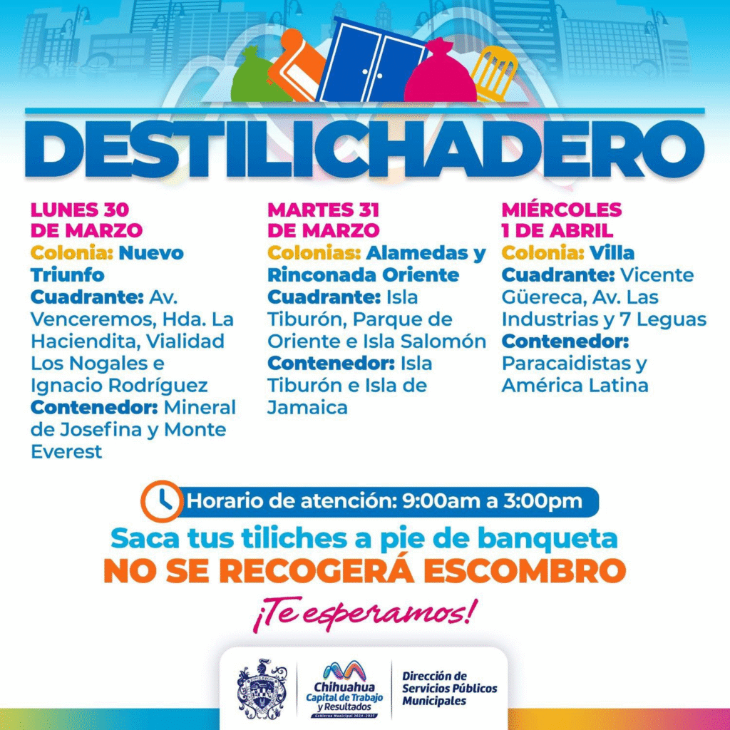Como parte de estas acciones preventivas, informó que el programa de destilichadero se realizará en las siguientes fechas y colonias: